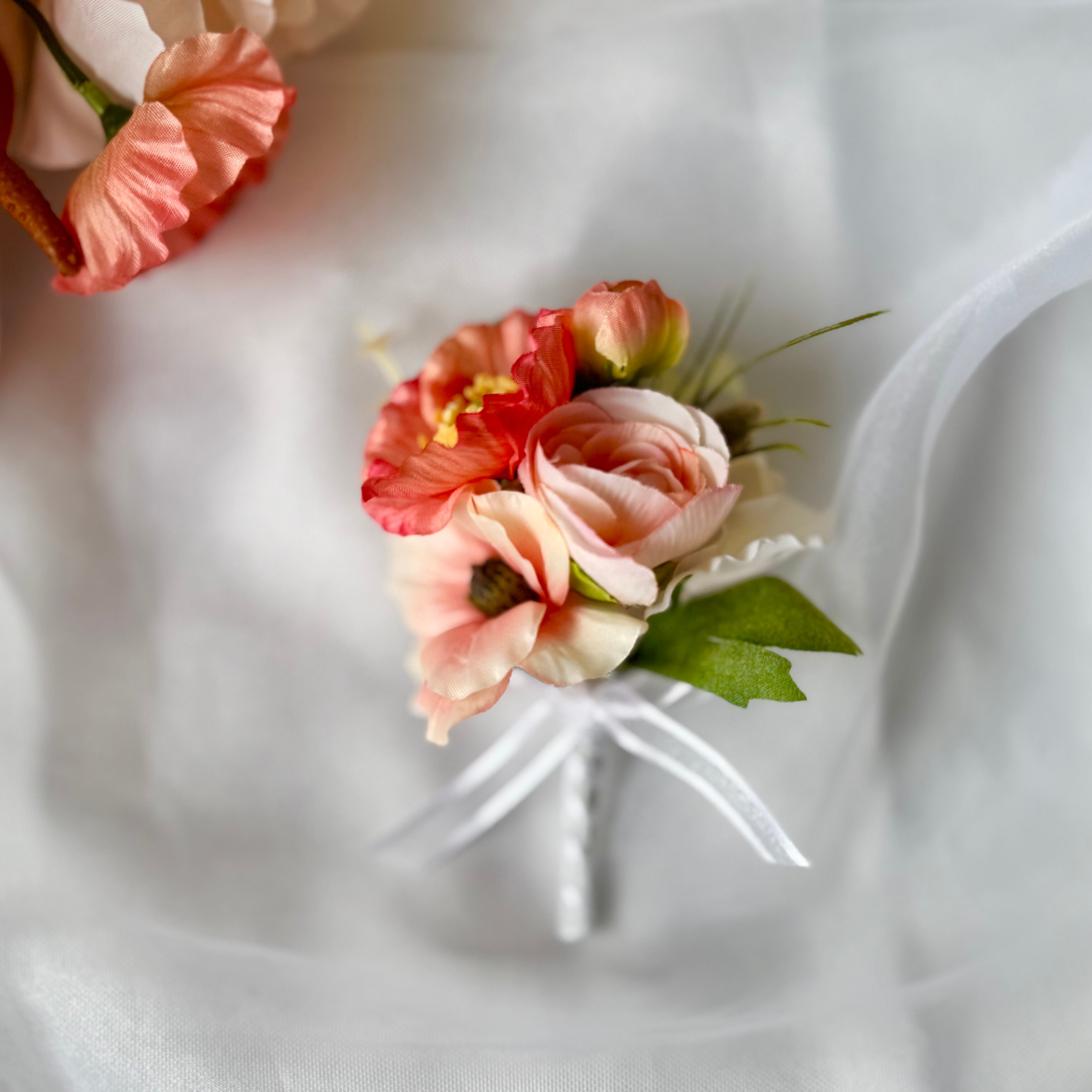 ブートニア(新郎用コサージュ)付きです。