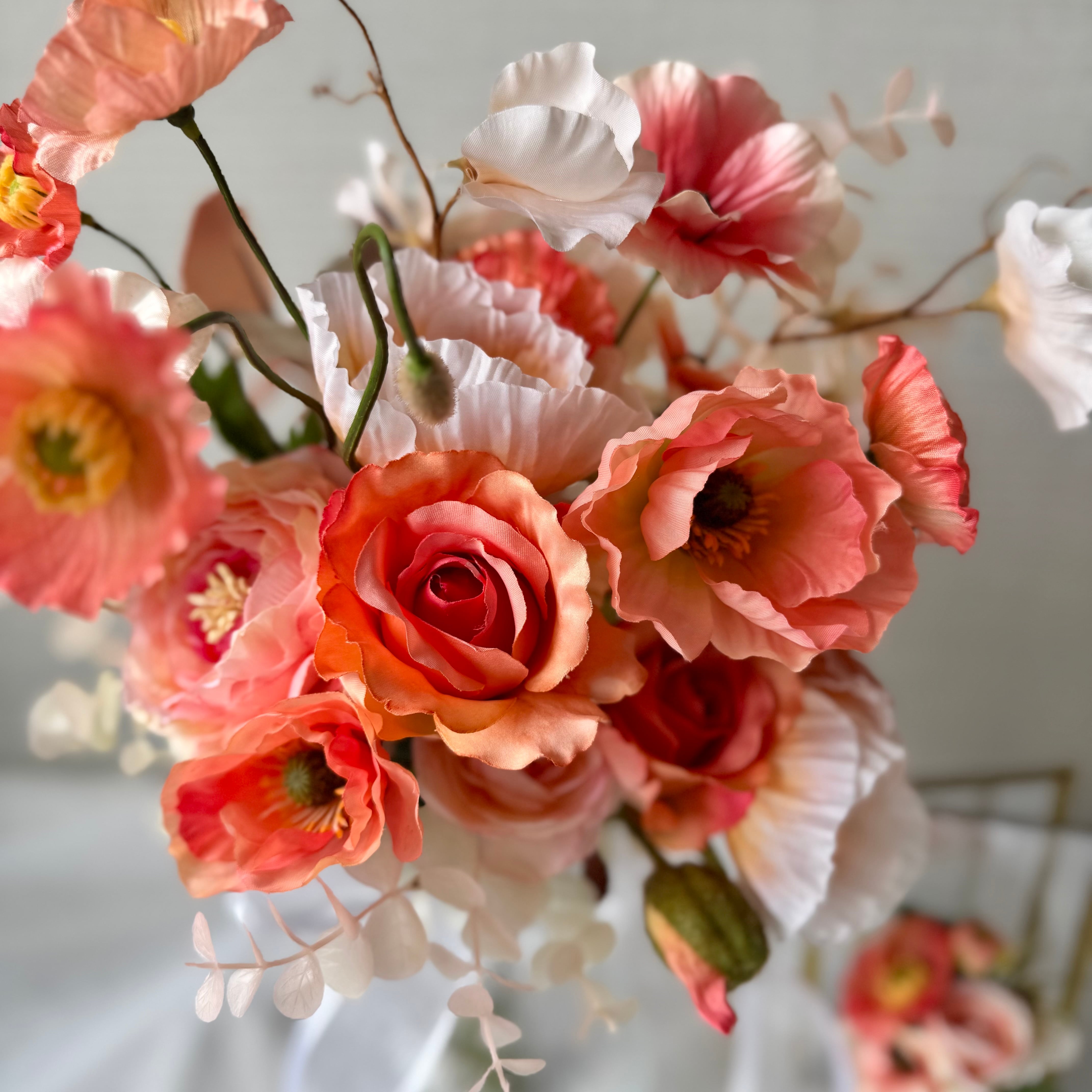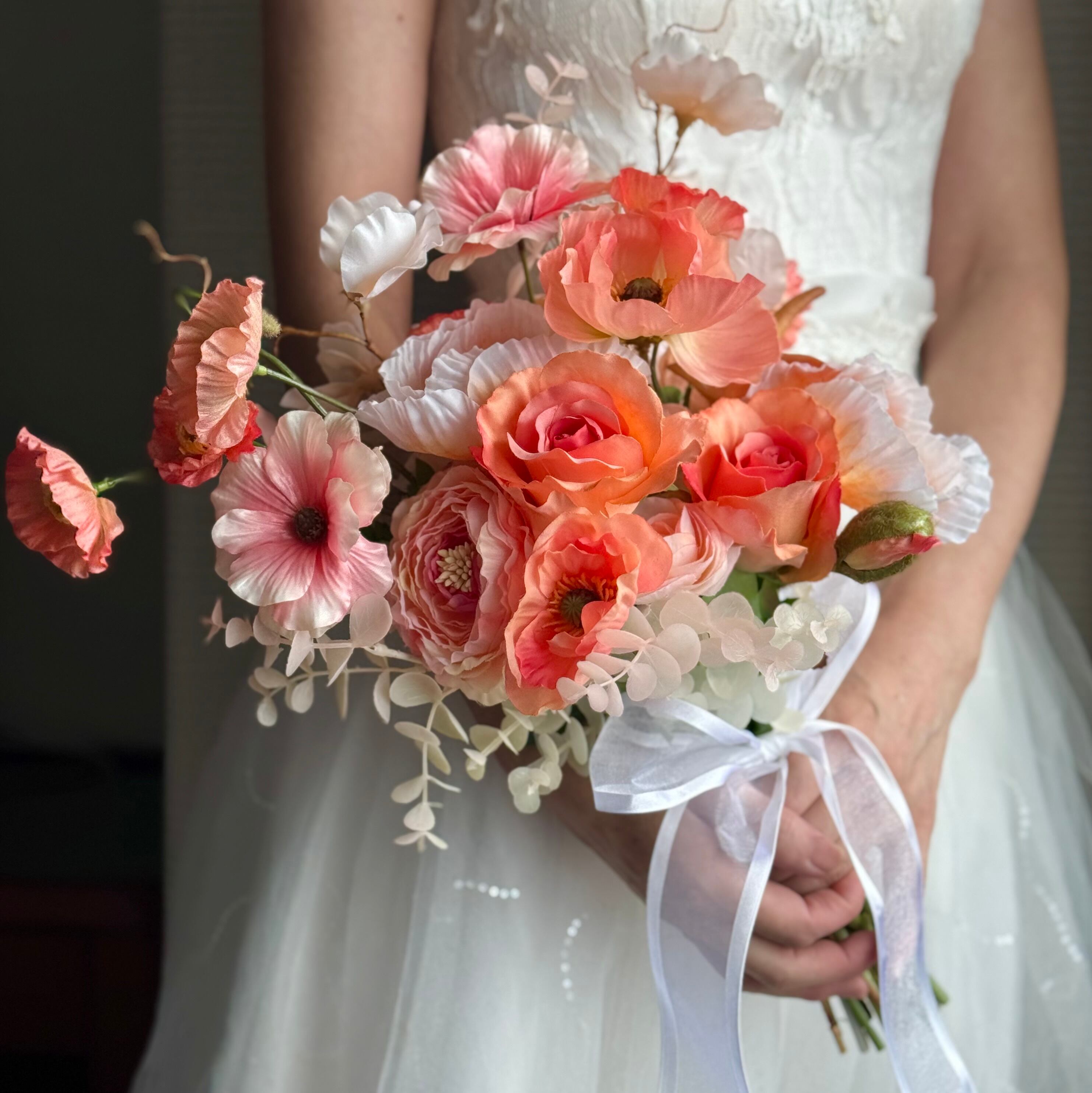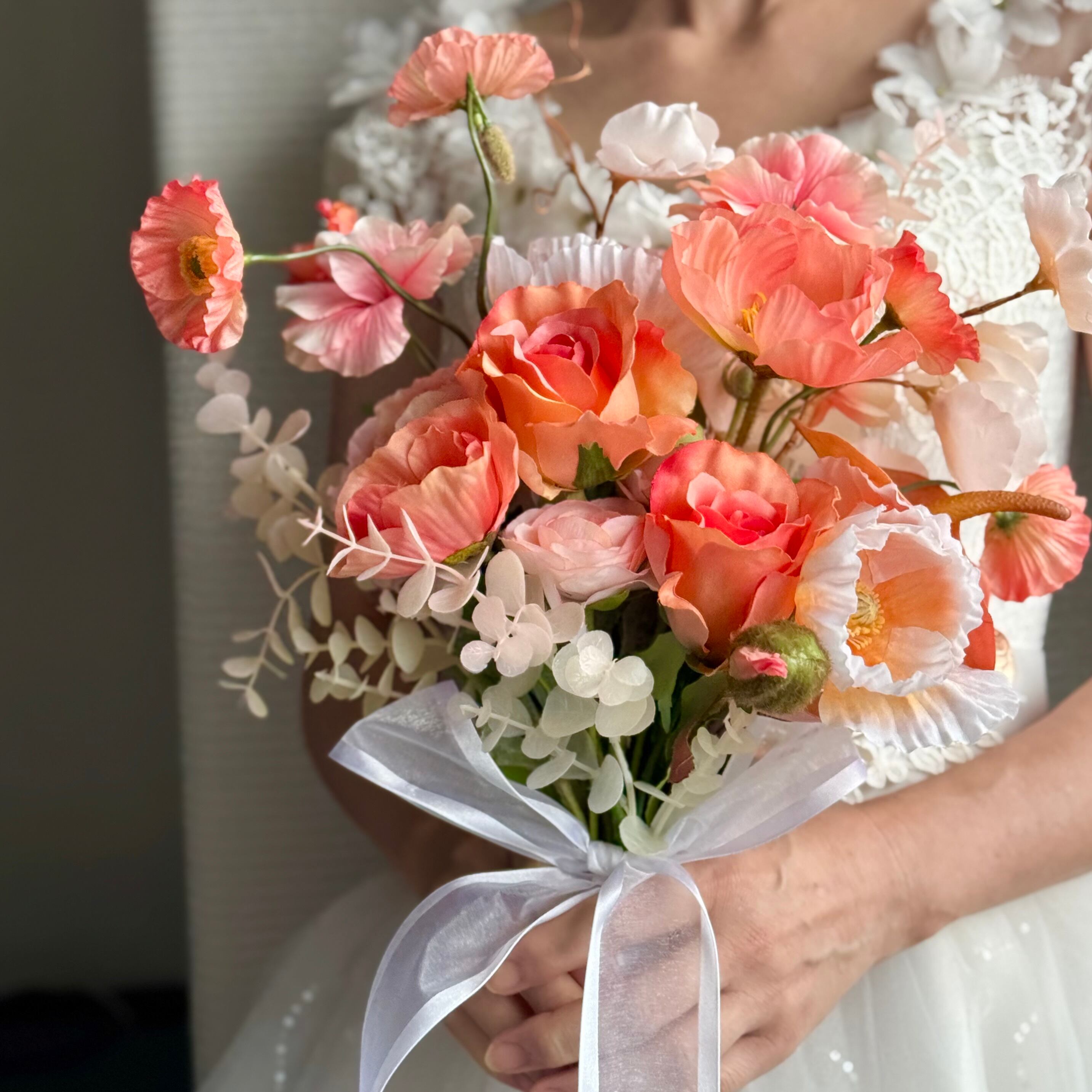 アーティフィシャルフラワーブーケは生花のような美しさと色鮮やかな風合いを長期間保てますので、一生の思い出となる結婚式で、ブーケの花がしおれたり、色あせたりする心配はありません。