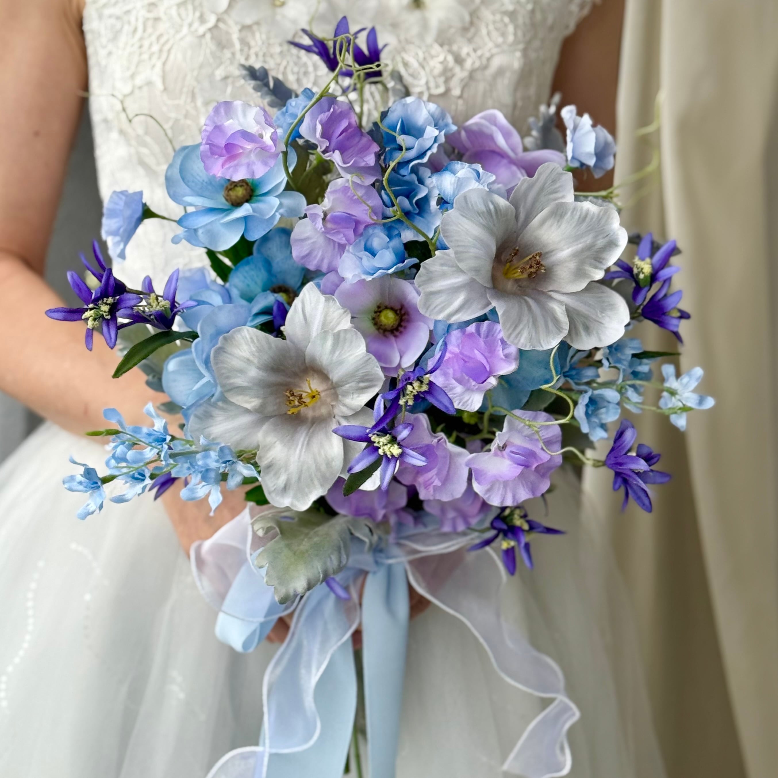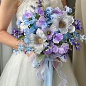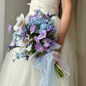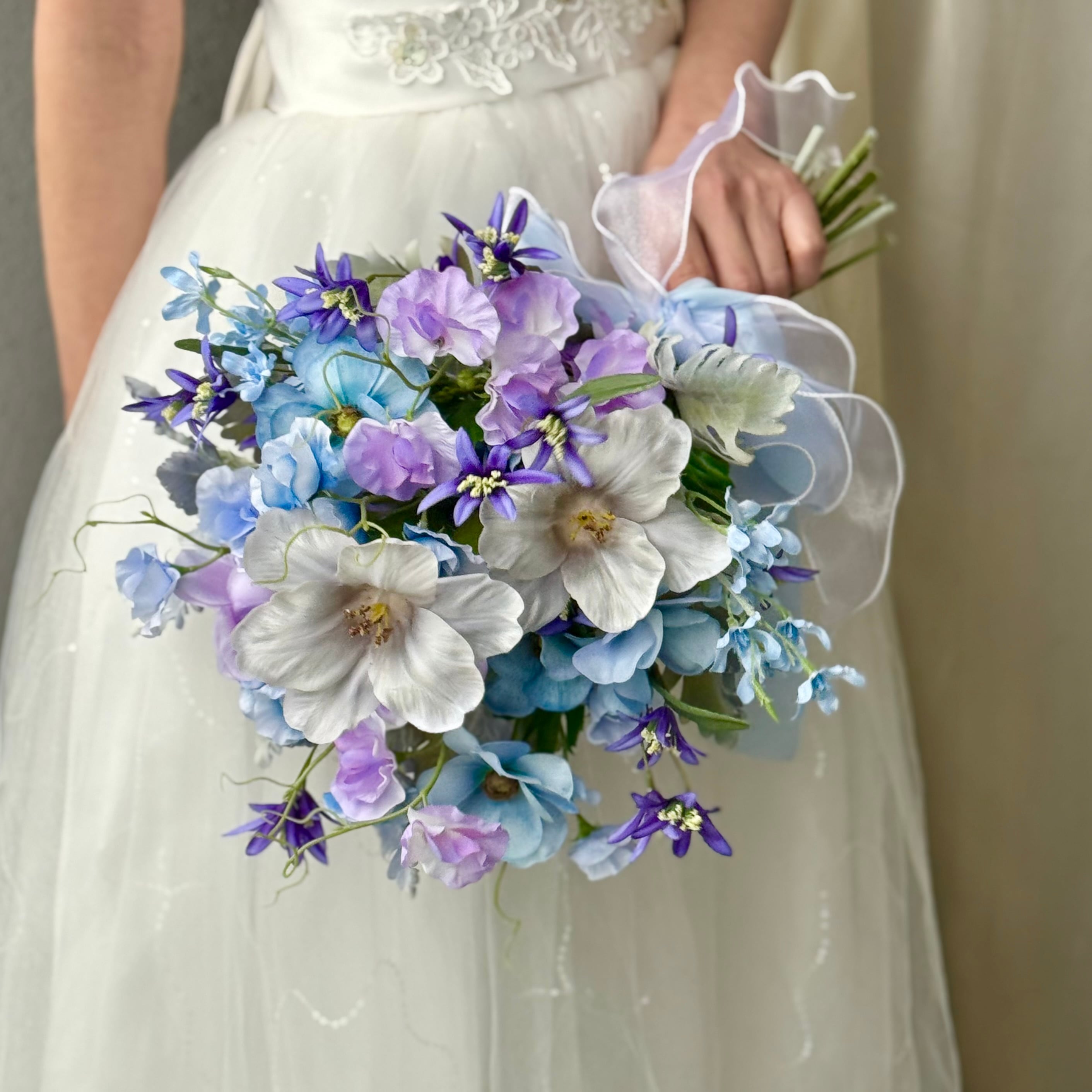 ブルーとパープルはとても相性のいい組み合わせ。ブルー系のドレスはもちろん、白ドレスにも寒色系がお好きな花嫁様にはピッタリなブーケです。