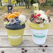 テイクアウトコーヒーカップ風の陶器製の植木鉢に木の実、ドライフルーツ、プリザーブドフラワーをアレンジしました。