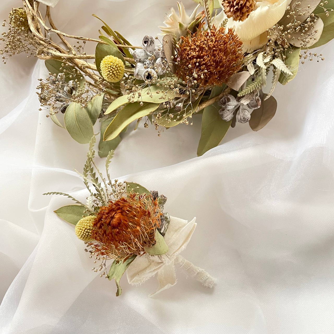ドライフラワーリースブーケとお揃いの新郎用コサージュです。