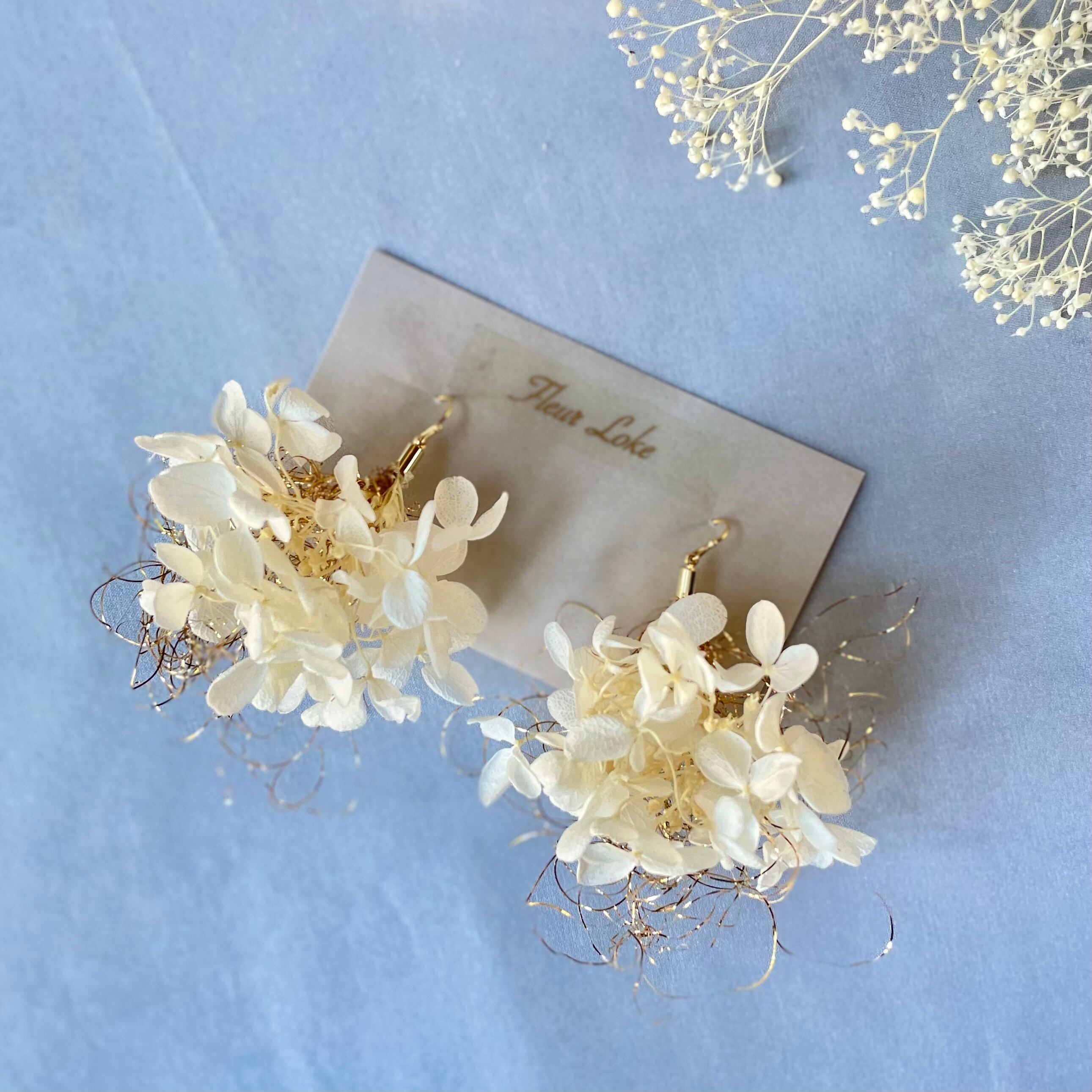 ドライフラワーピアス アジサイホワイト×ゴールドラメ ウェディング 結婚式 前撮り プレ花嫁 パーティー
