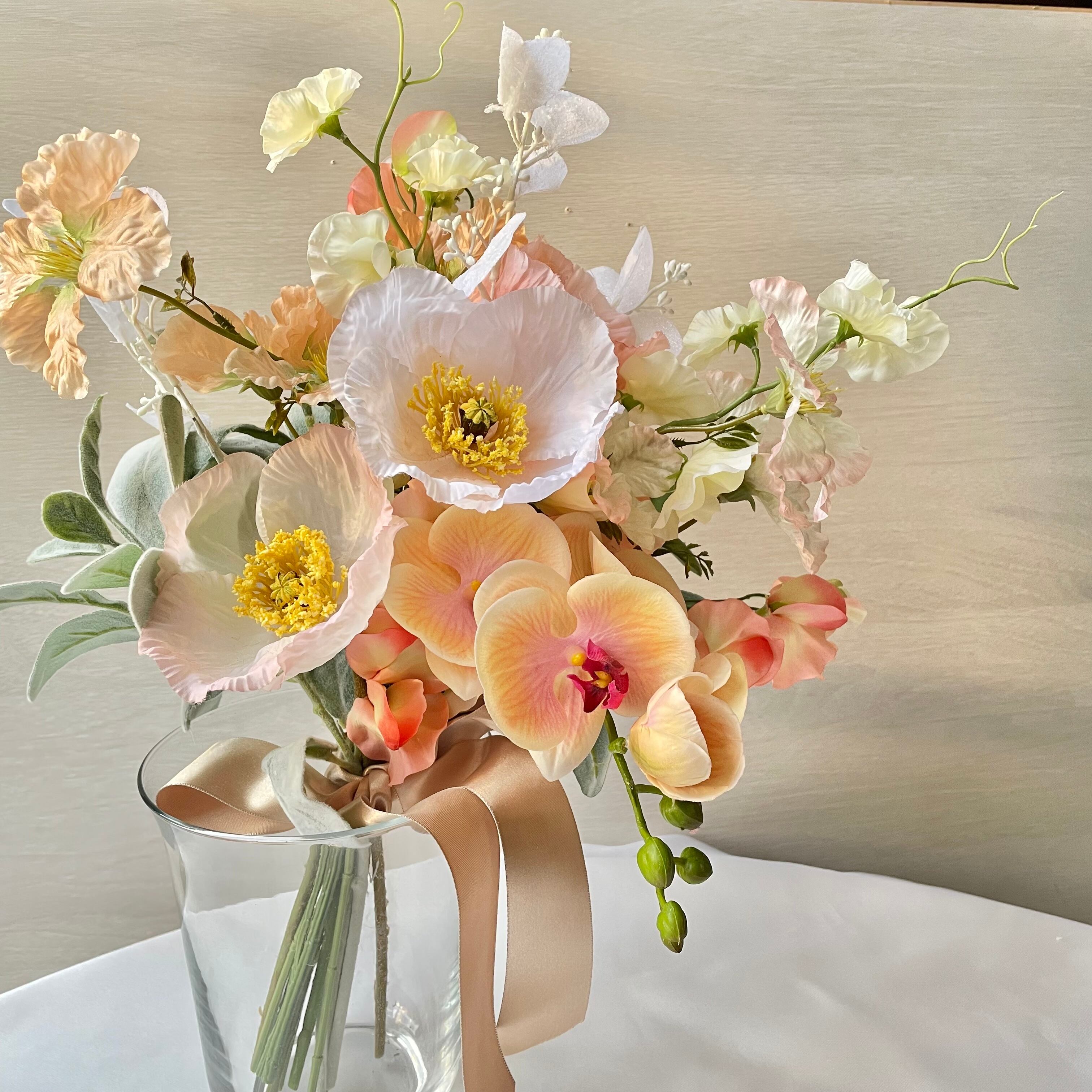 人気の高い胡蝶蘭にポピーやスイトピーなど春のお花をたくさん使った、ふわふわエアリーなアーティフィシャルブーケです。