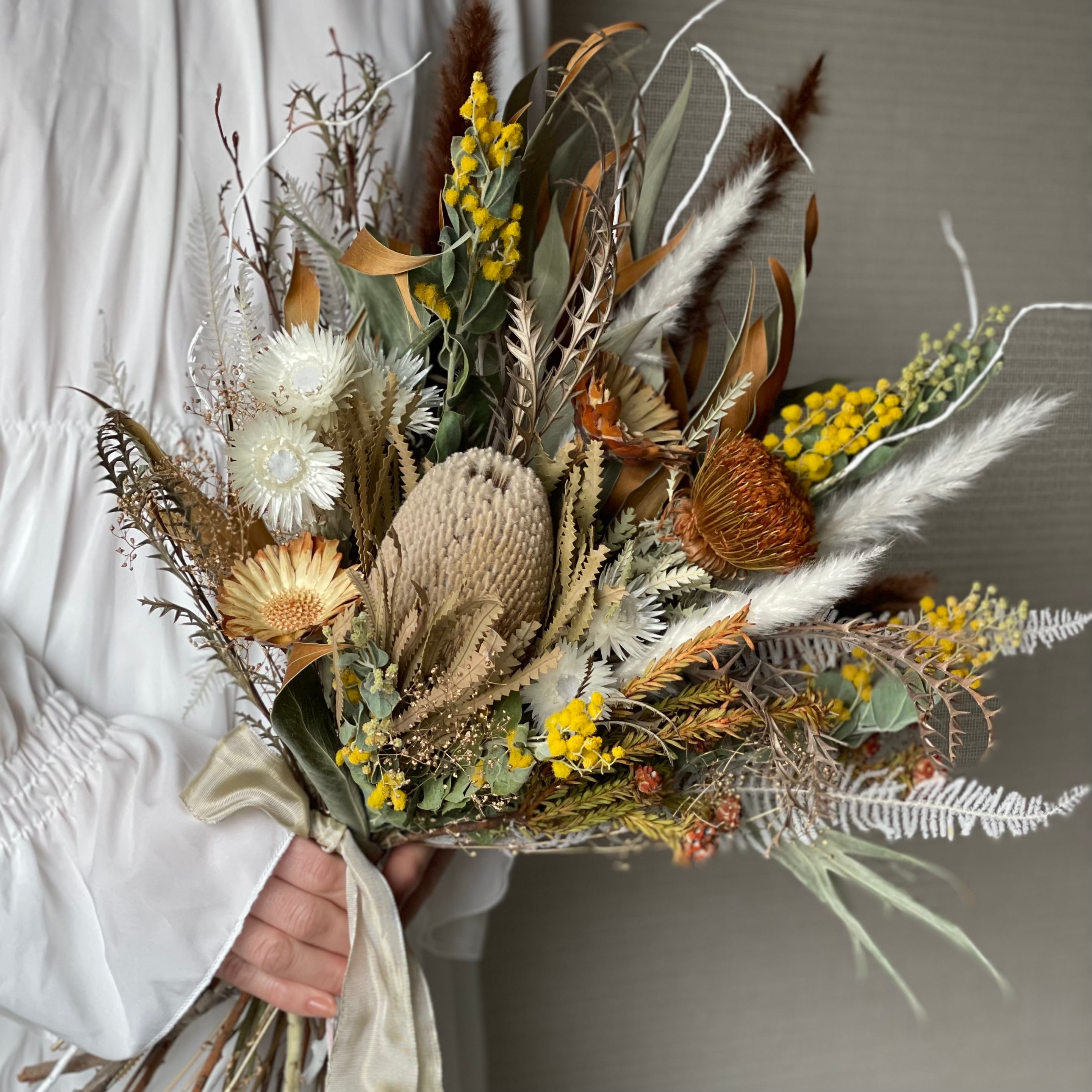 バンクシアをメインにこの時期ならではのドライミモザをポイントで入れました。
