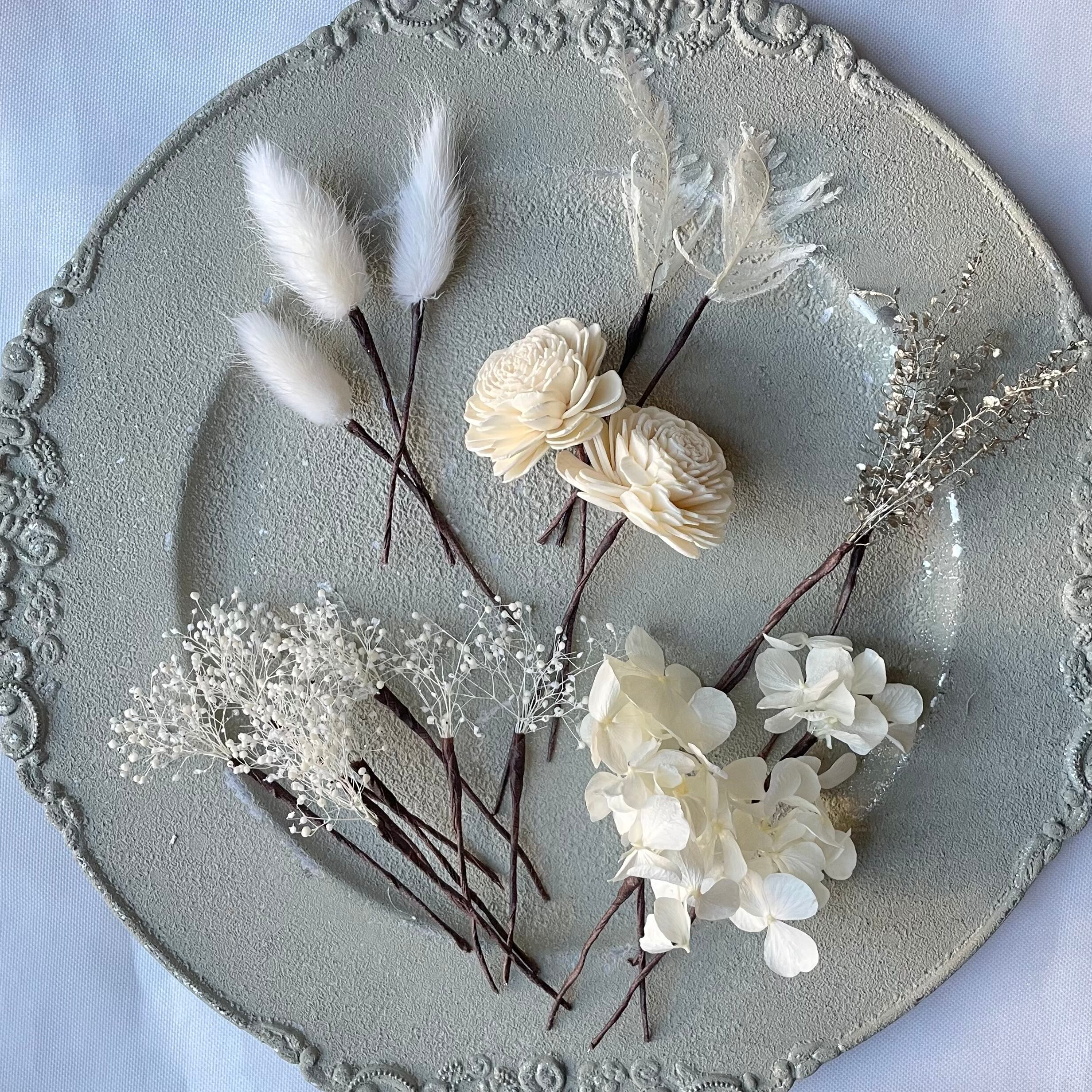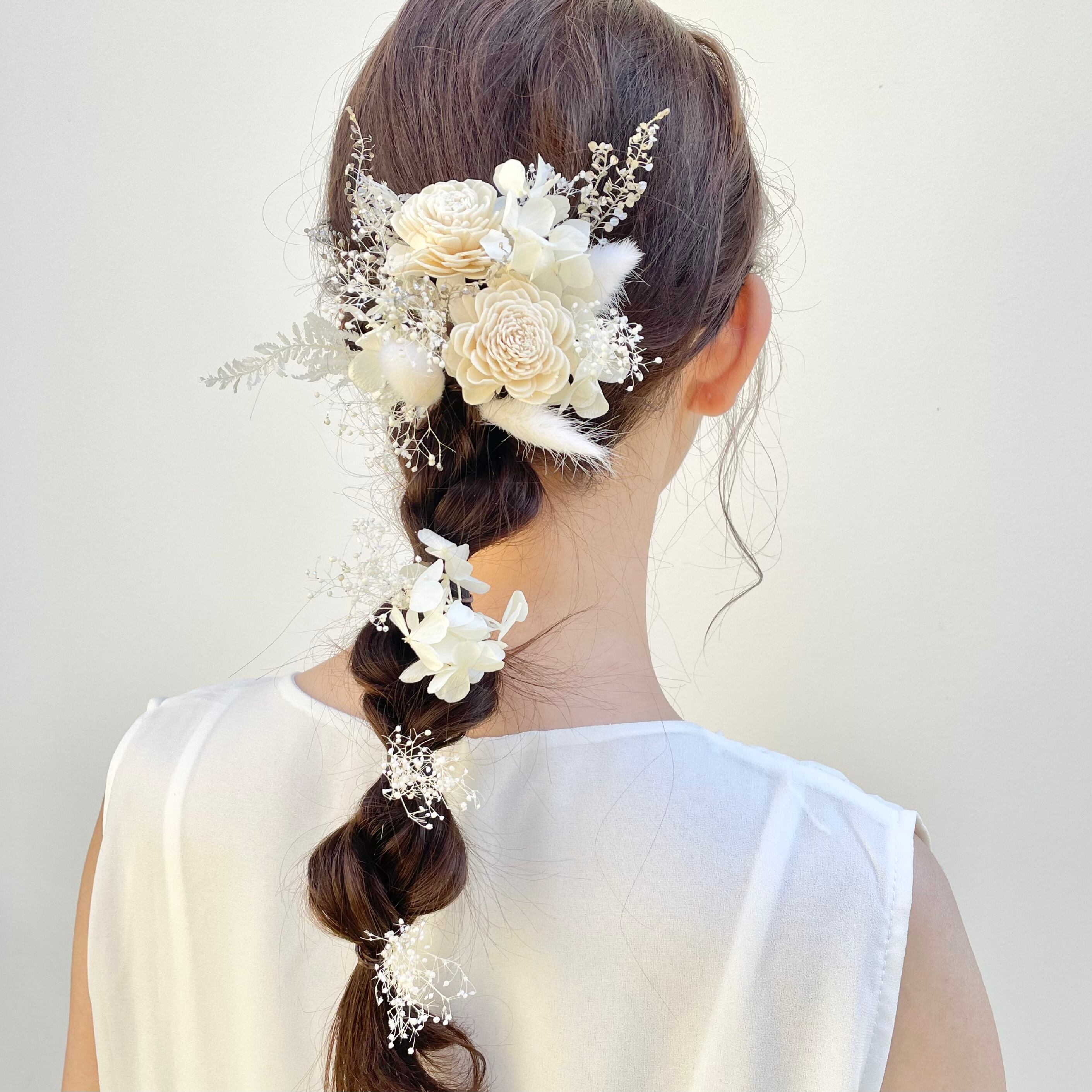 白いお花メインなので、とても使いやすい色合いです。ウェディングはもちろん、結婚式へのゲスト出席やパーティ用に、、和装婚、振袖や袴などの髪飾りにもドライフラワーはとても似合います。